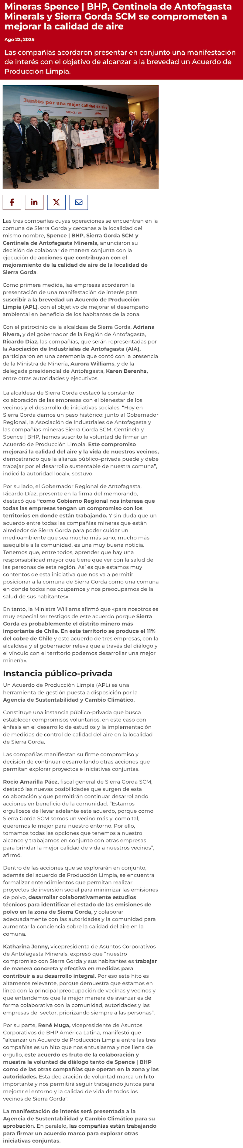 Mineras de Sierra Gorda acuerdan mejorar calidad del aire en la zona - (El Mercurio de Antofagasta)