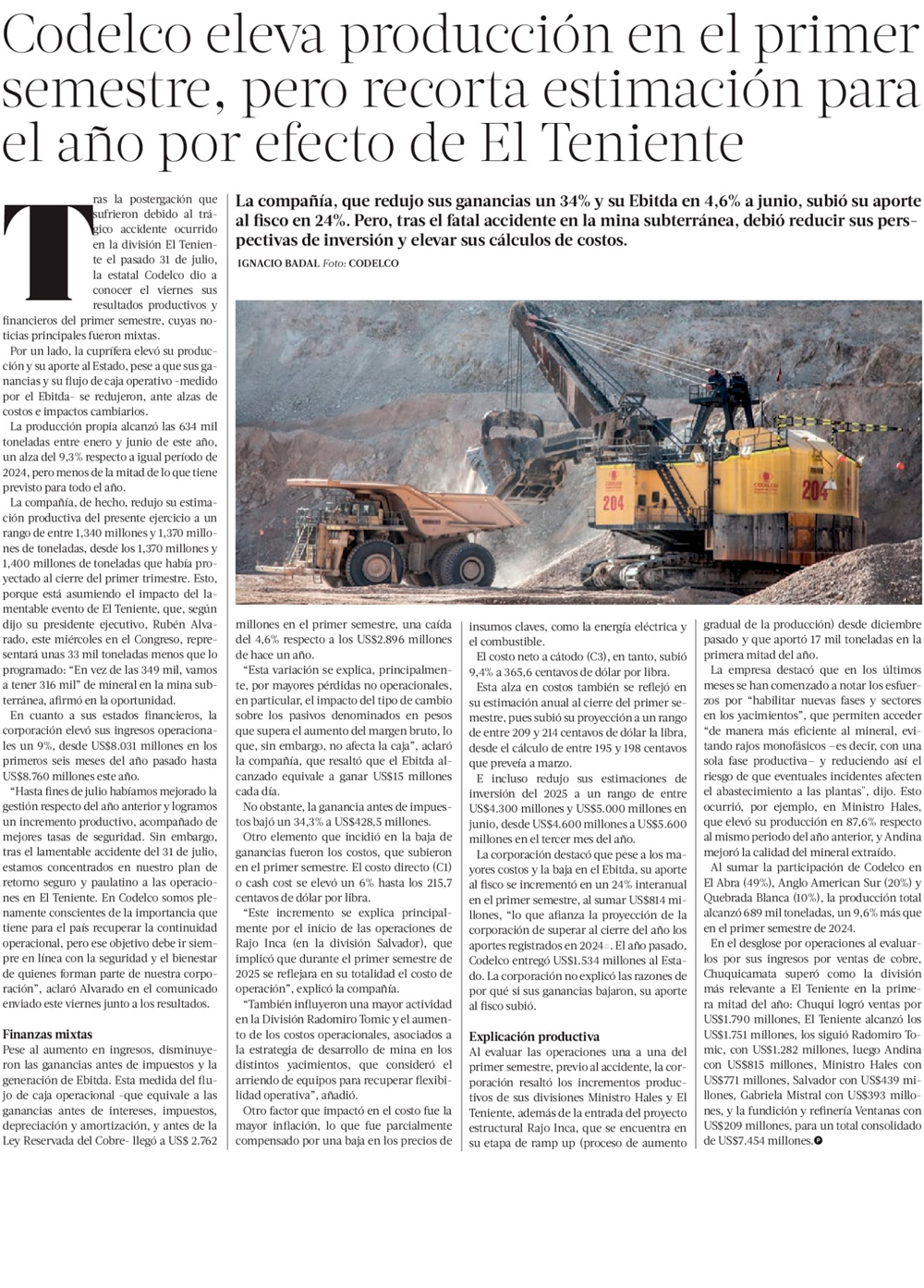 Pese a un buen primer semestre, Codelco ve alza en costos y menor producción en 2025 - (El Mercurio de Santiago)