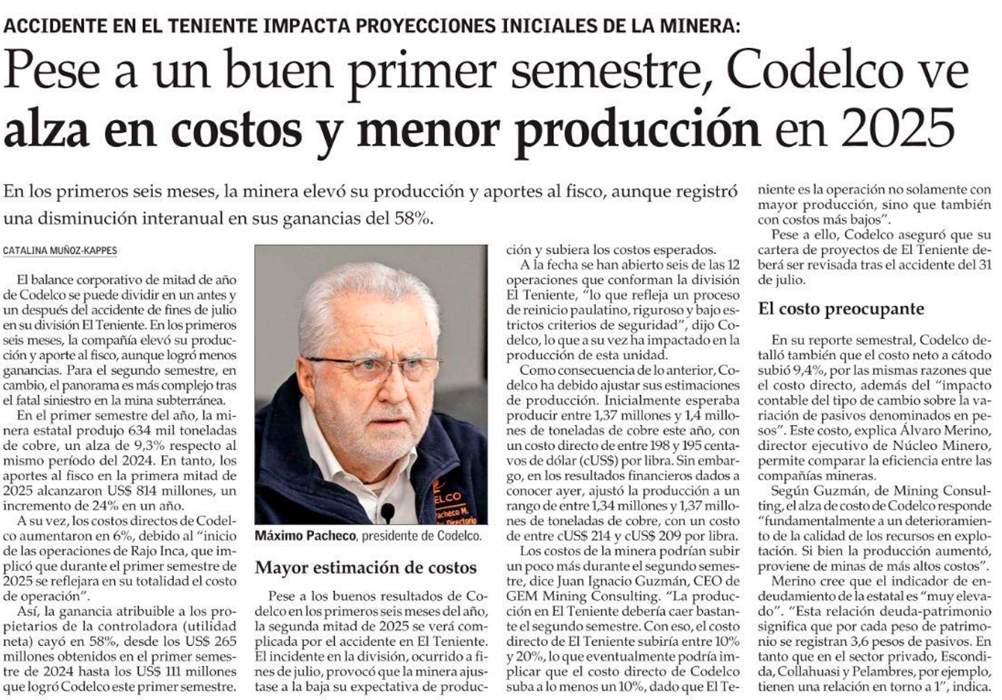 Codelco alcanza 634 mil toneladas de producción propia en el primer semestre - (El Mercurio de Antofagasta)