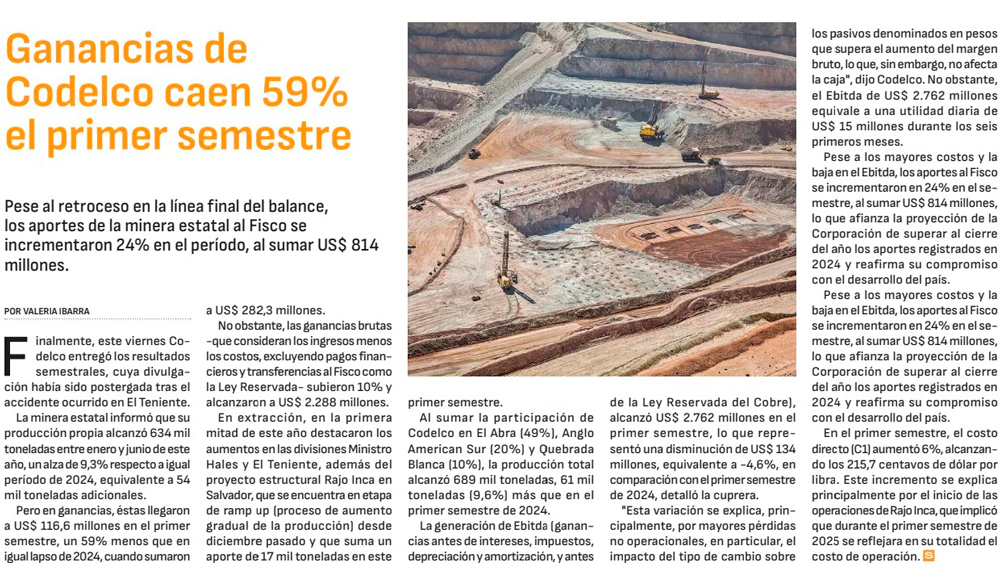 Pese a un buen primer semestre, Codelco ve alza en costos y menor producción en 2025 - (El Mercurio de Santiago)