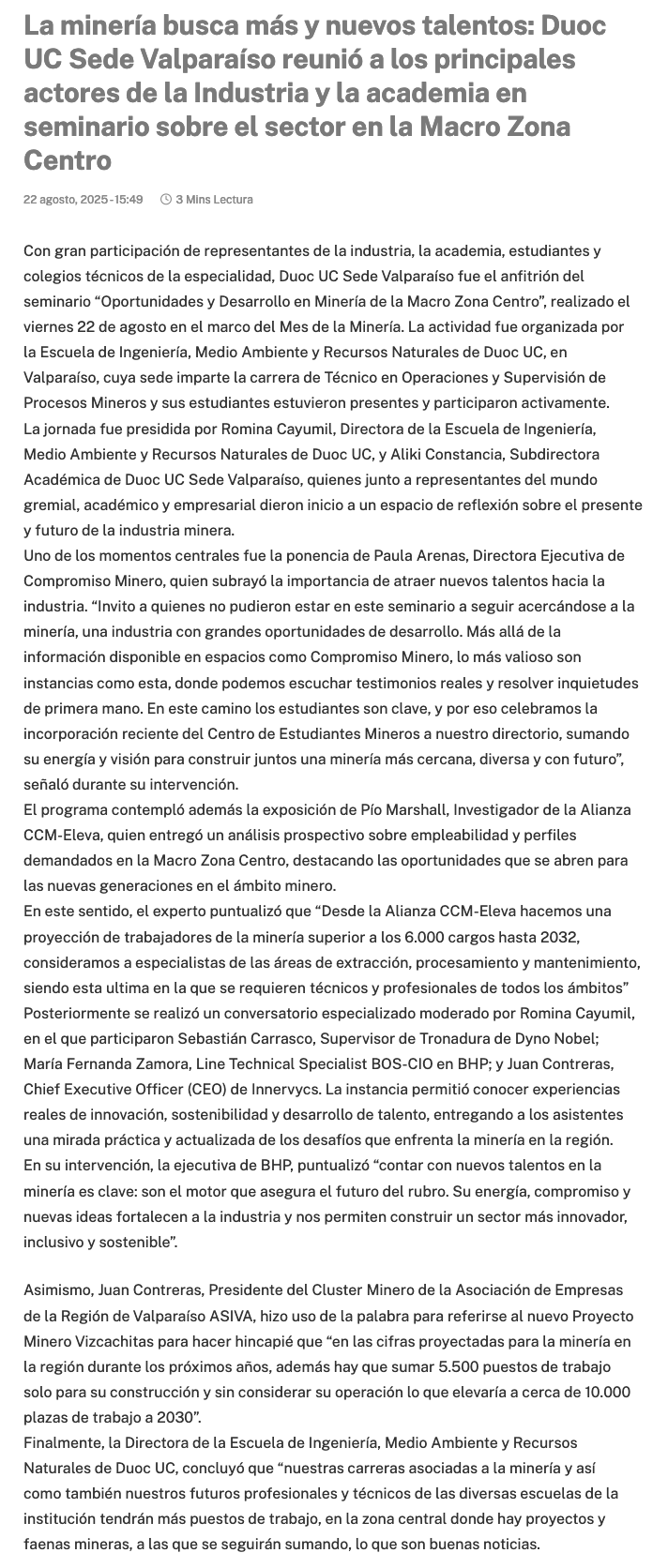 La minería busca nuevos talentos: Duoc UC Valparaíso reunió a industria y academia en seminario - (contraplano.cl)