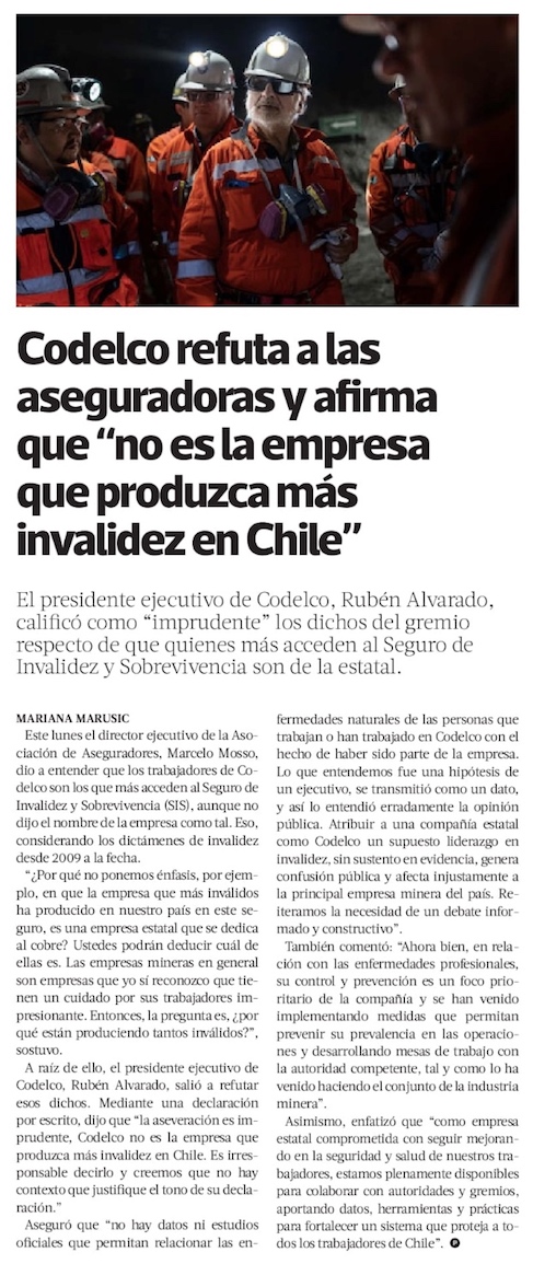 Codelco se enfrenta con Aseguradores por SIS y califica declaración del gremio como imprudente - (Diario Financiero)