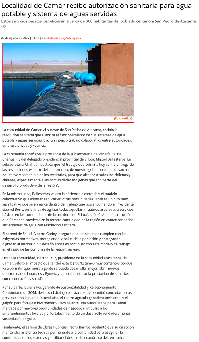 Comunidad de Camar recibe resolución sanitaria para sistemas de agua potable y servidas - (elreferente.cl)