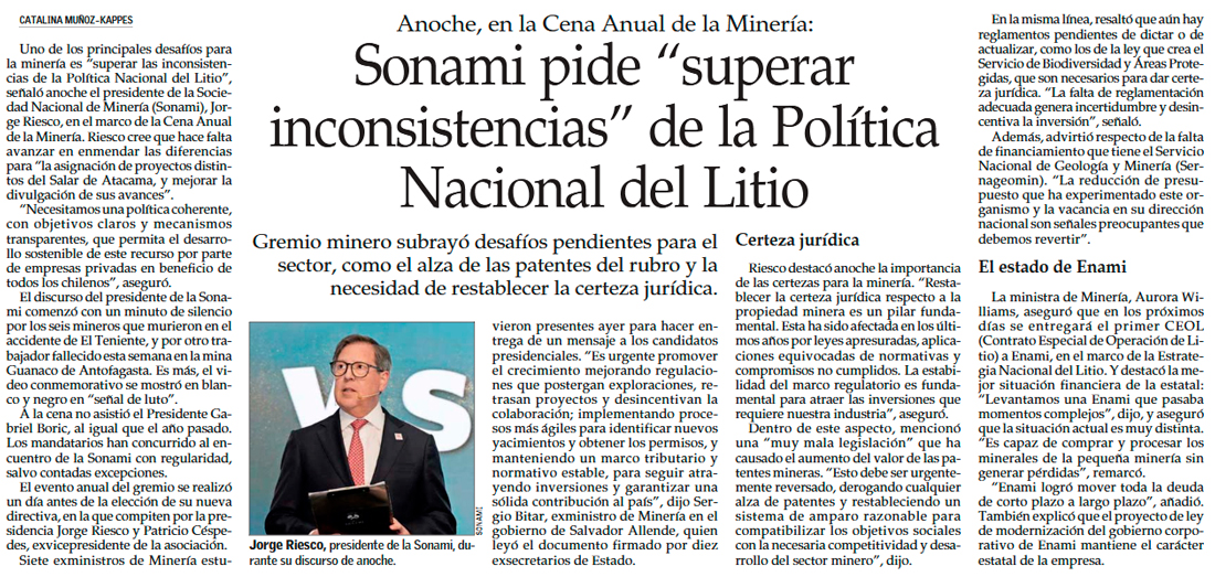 Sonami urge por nuevo pacto público-privado y critica falta de visión de largo plazo en minería - (Diario Financiero)