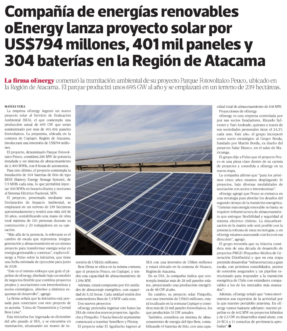 Empresa oEnergy ingresa al SEIA parque fotovoltaico por US$ 794 millones en la Región de Atacama - (Diario Financiero)
