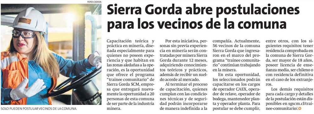 Sierra Gorda SCM abre postulaciones a vecinos de la comuna para que trabajen en sus operaciones - (region2)
