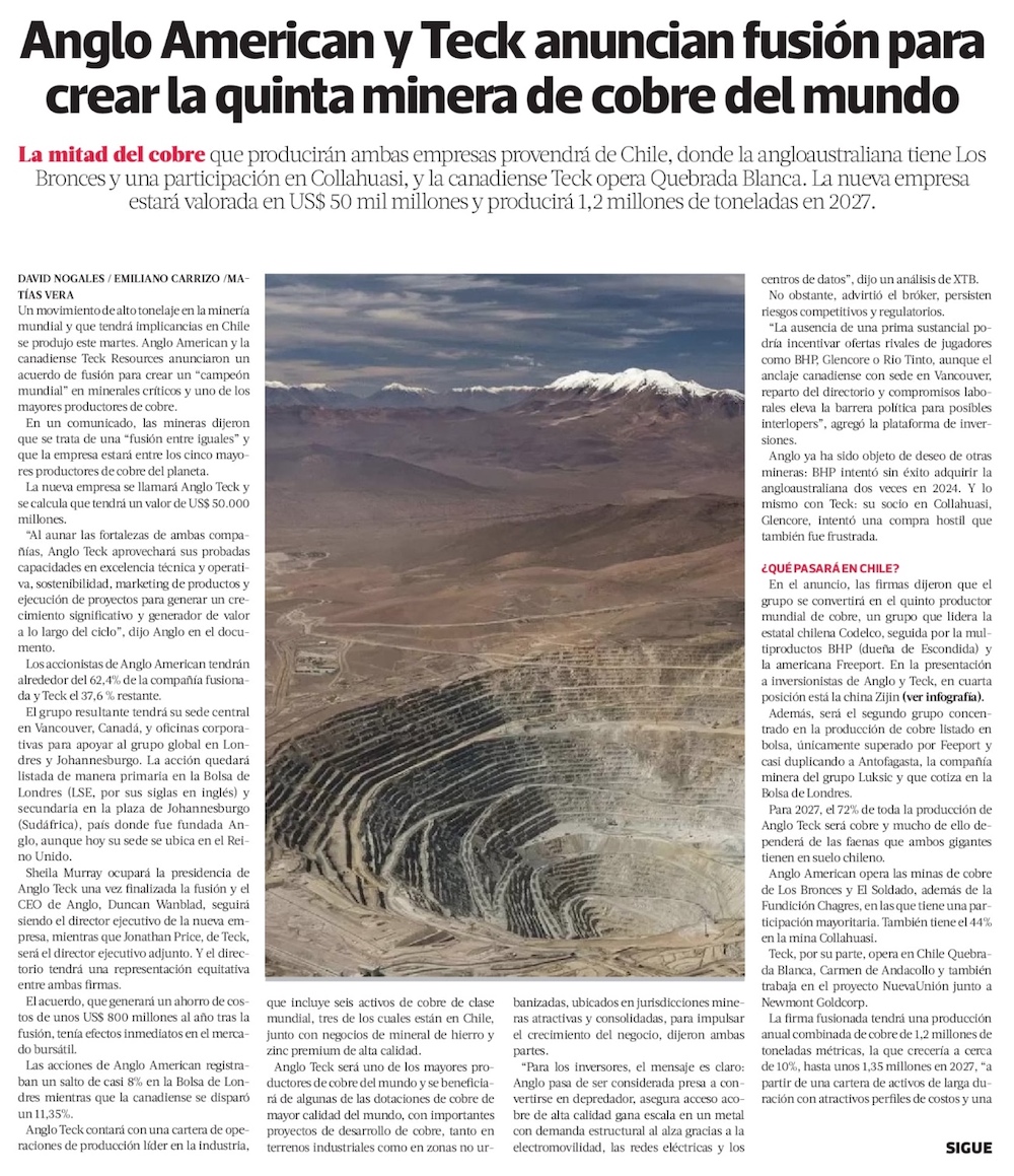 Anglo American adquirirá Teck y nueva firma será la tercera mayor cuprífera del país - (El Mercurio de Santiago)