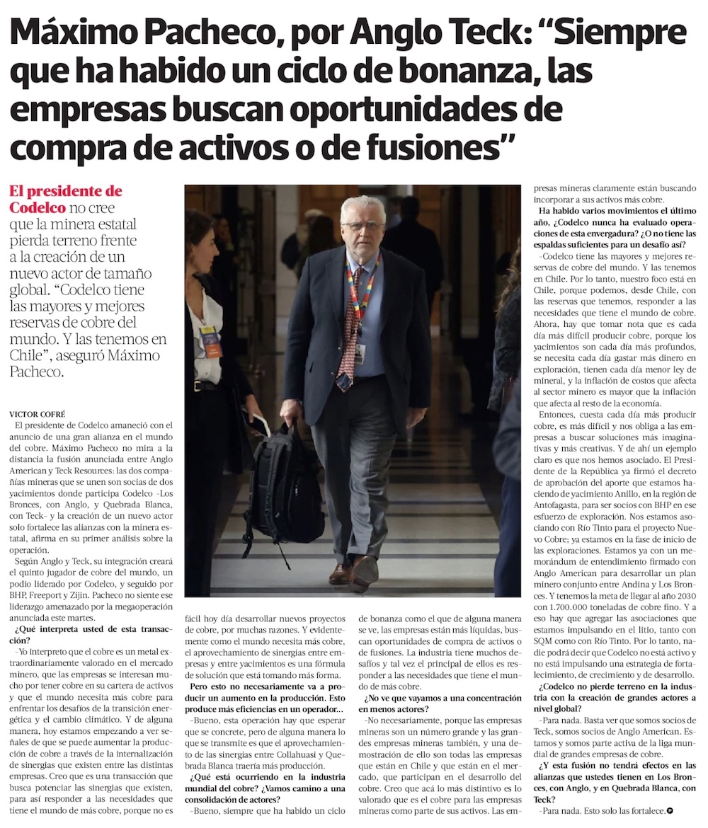 Máximo Pacheco por fusión de Anglo American-Teck: "Nuestro país consolida su liderazgo global en un mineral crítico" - (soyantofagasta)