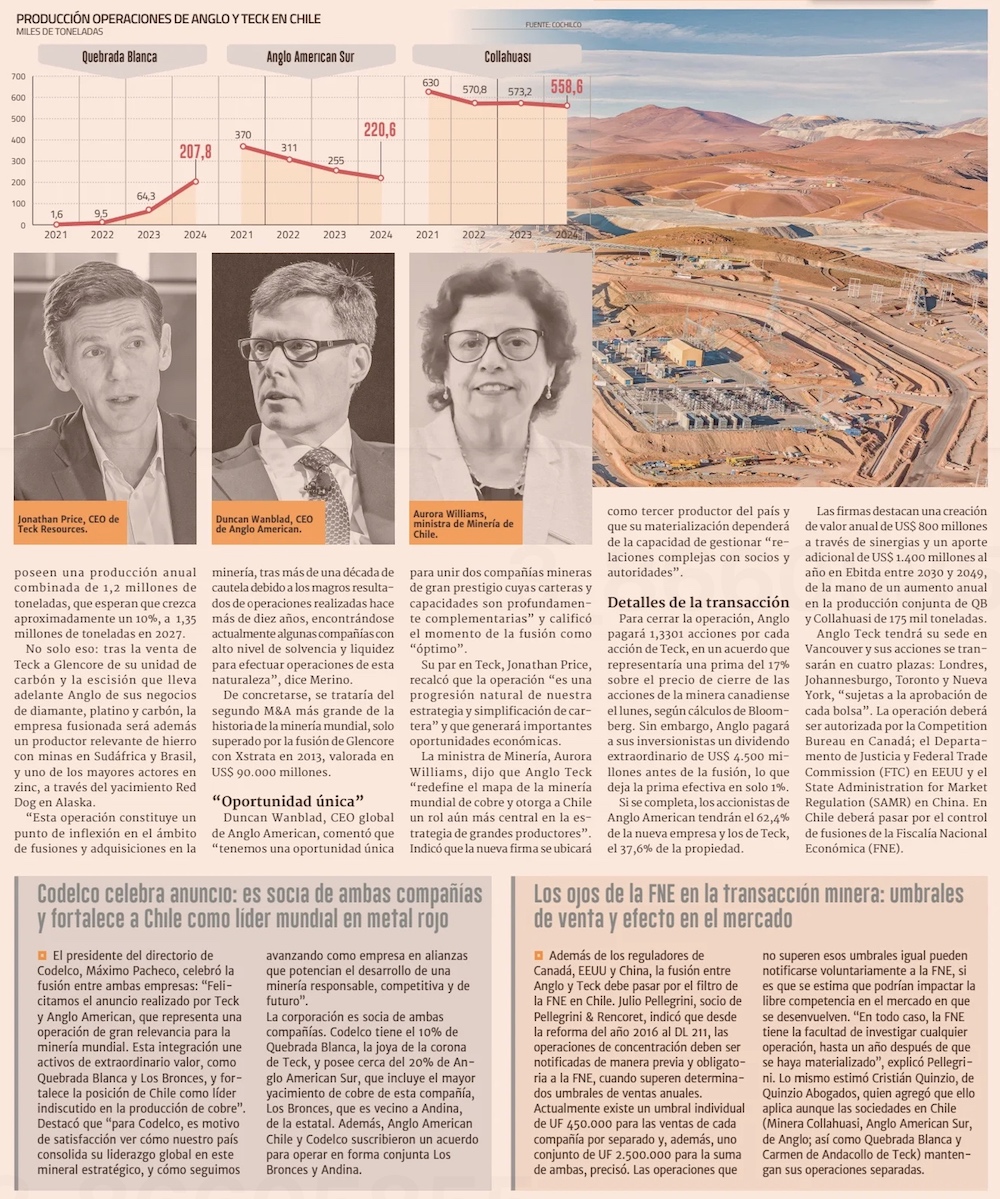 Anglo American adquirirá Teck y nueva firma será la tercera mayor cuprífera del país - (El Mercurio de Santiago)