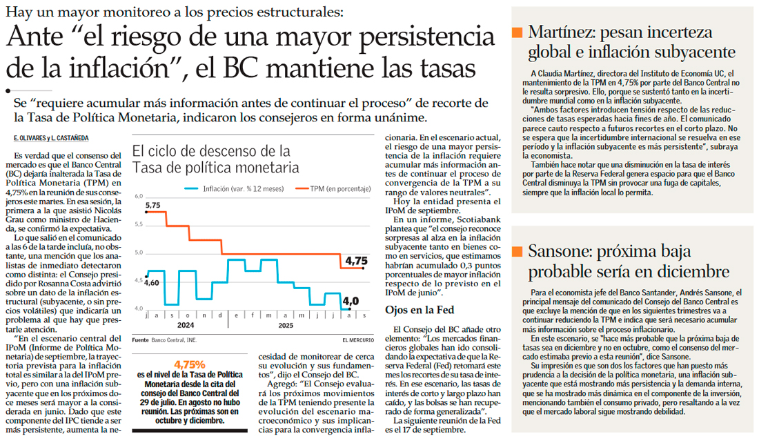 Banco Central mantiene la tasa y pone en duda nuevas bajas por riesgo de inflación - (Diario Financiero)