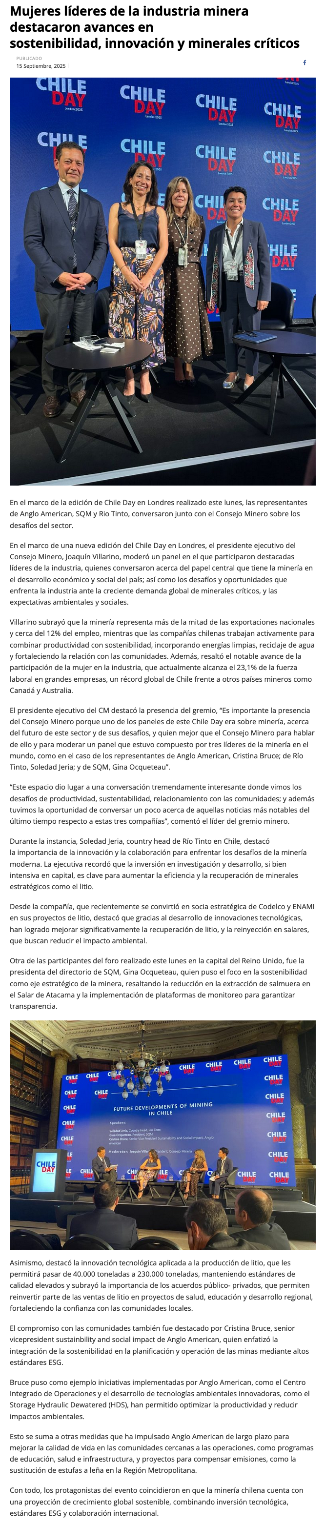 Chile Day: Mujeres líderes de la industria minera resaltan avances en sostenibilidad, innovación y minerales críticos - (mch.cl)