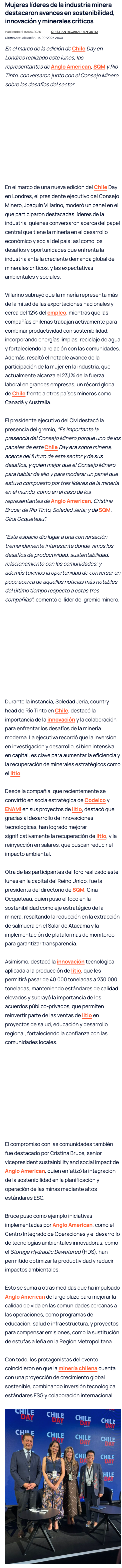 Chile Day: Mujeres líderes de la industria minera resaltan avances en sostenibilidad, innovación y minerales críticos - (mch.cl)