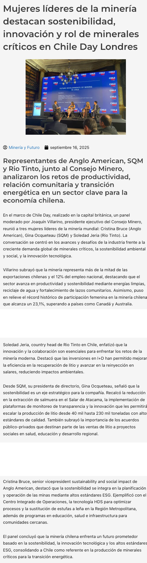 Chile Day: Mujeres líderes de la industria minera resaltan avances en sostenibilidad, innovación y minerales críticos - (mch.cl)