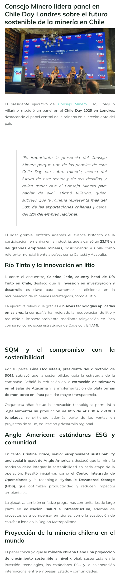 Consejo Minero lidera panel en Chile Day Londres sobre el futuro sostenible de la minería en Chile - (reporteminero)