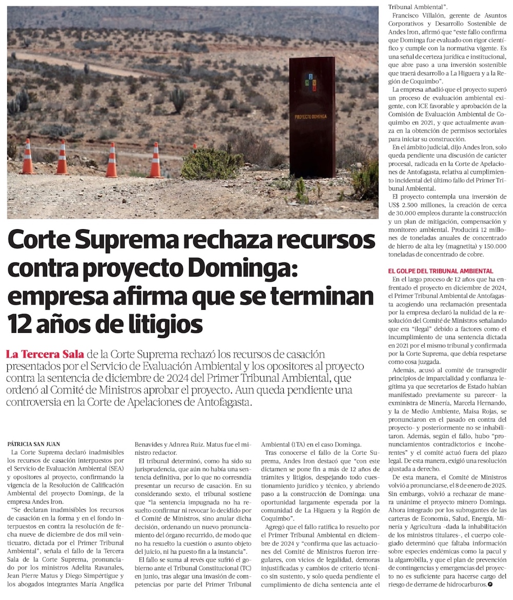 Duro revés para el Gobierno: Fallo crucial de la Suprema despeja el camino para reactivar Dominga - (El Mercurio de Santiago)