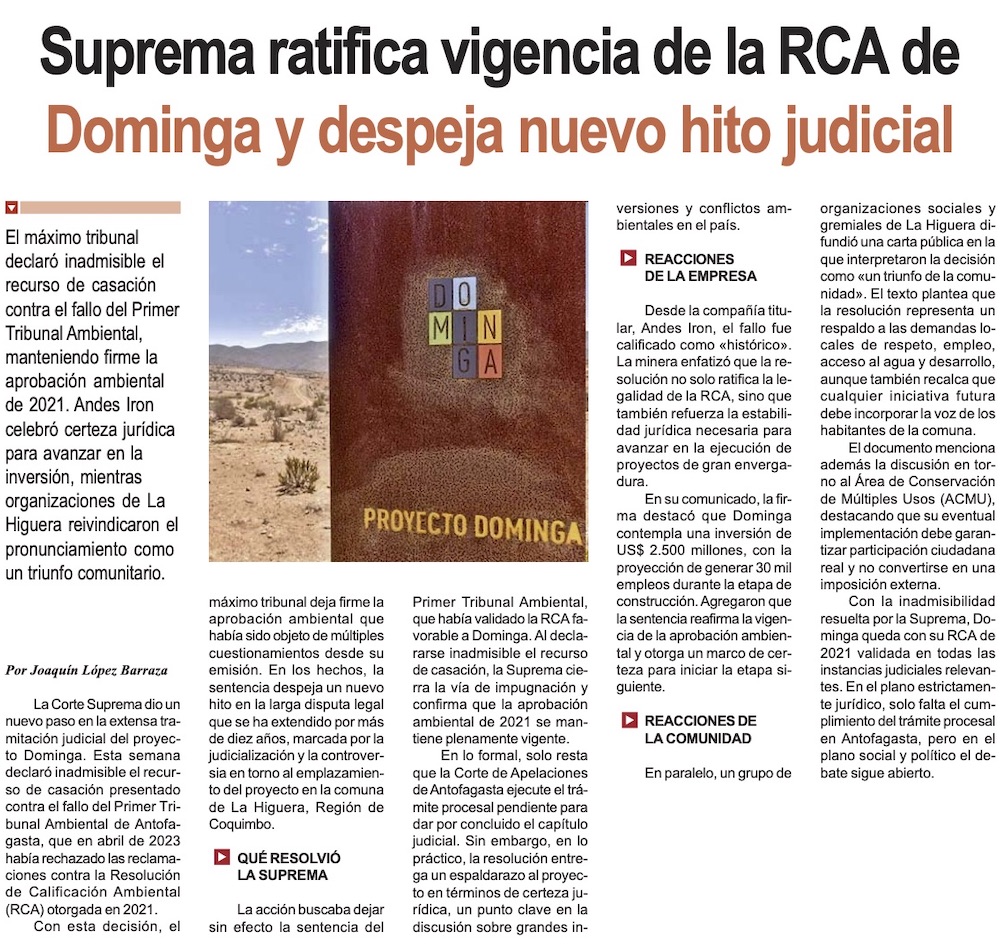Duro revés para el Gobierno: Fallo crucial de la Suprema despeja el camino para reactivar Dominga - (El Mercurio de Santiago)