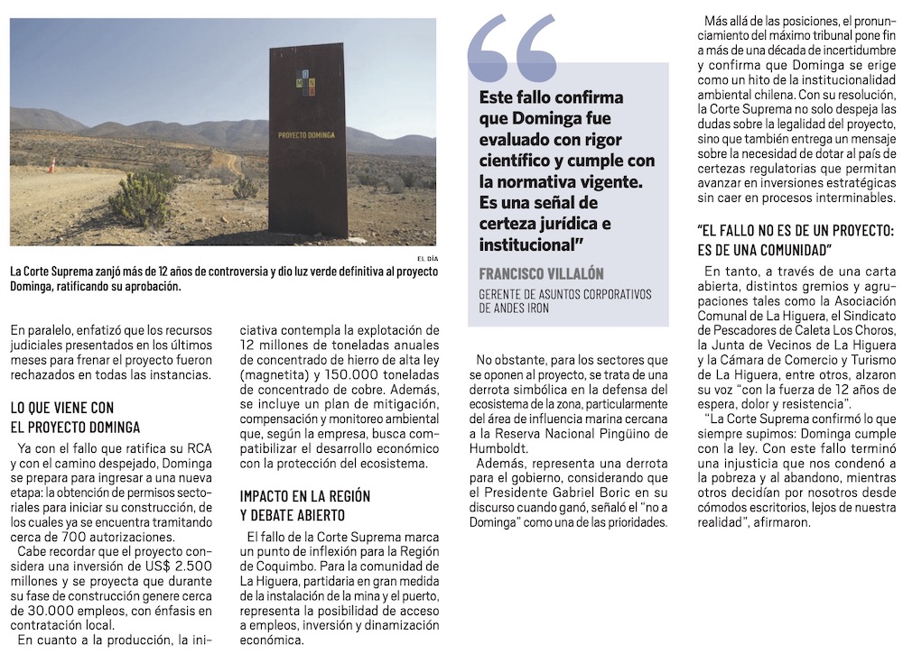 Suprema ratifica vigencia de la RCA de Dominga y despeja nuevo hito judicial. - (La Región)
