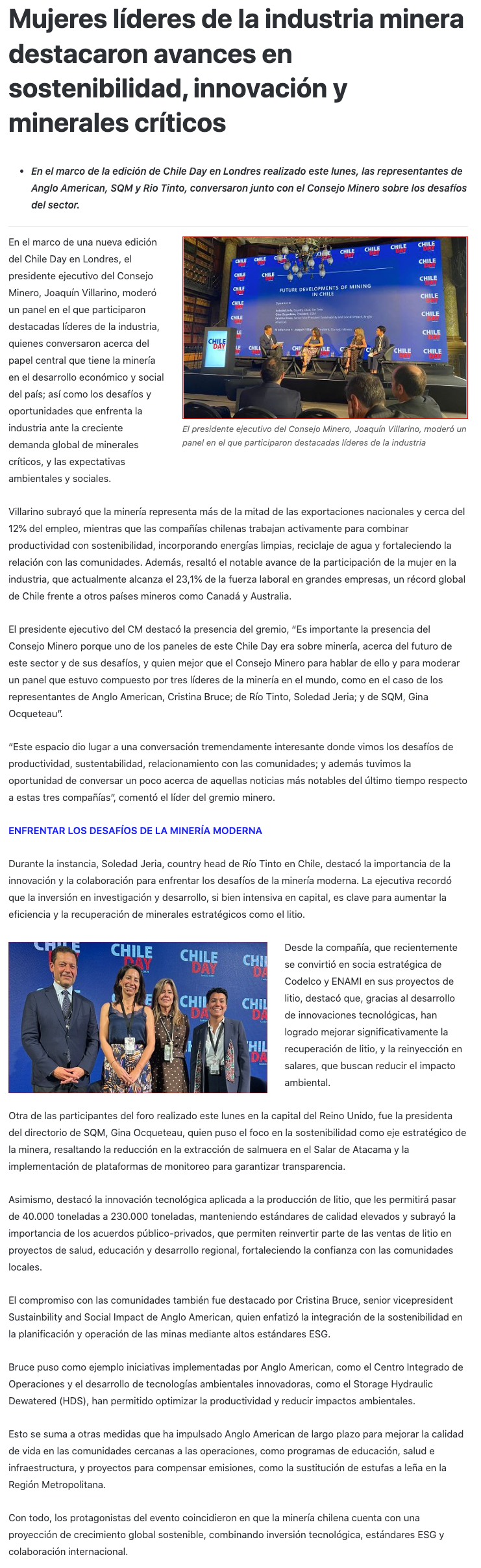 Chile Day: Mujeres líderes de la industria minera resaltan avances en sostenibilidad, innovación y minerales críticos - (mch.cl)