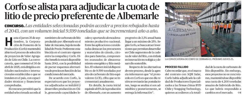 Corfo se alista para adjudicar la cuota de litio de precio preferente de Albemarle - (El Mercurio de Antofagasta)