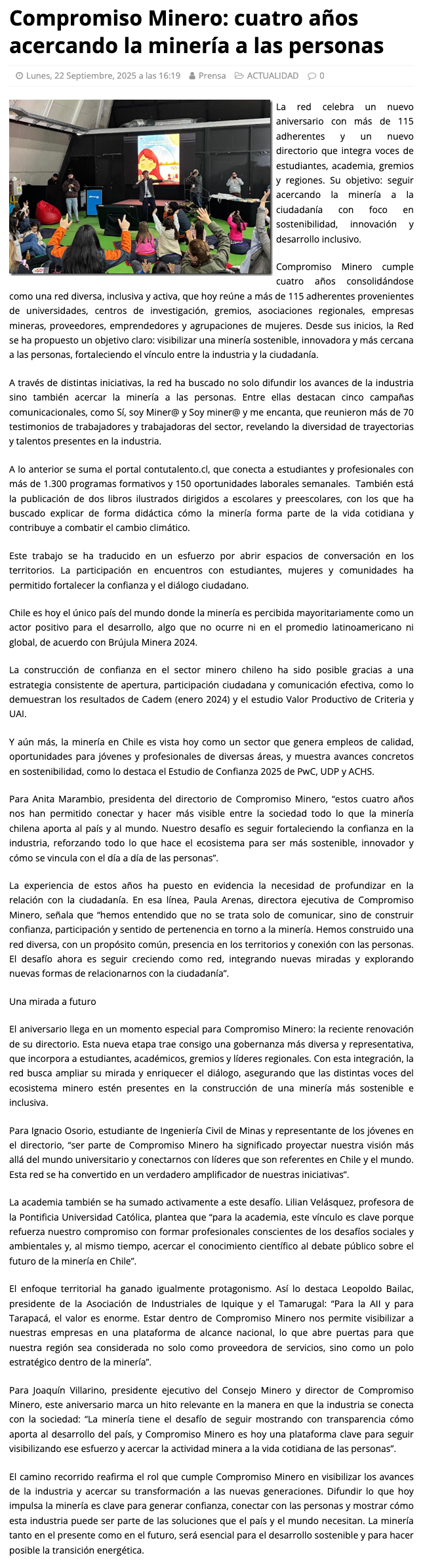 Compromiso Minero: cuatro años acercando la minería a las personas - (norteonline.cl)