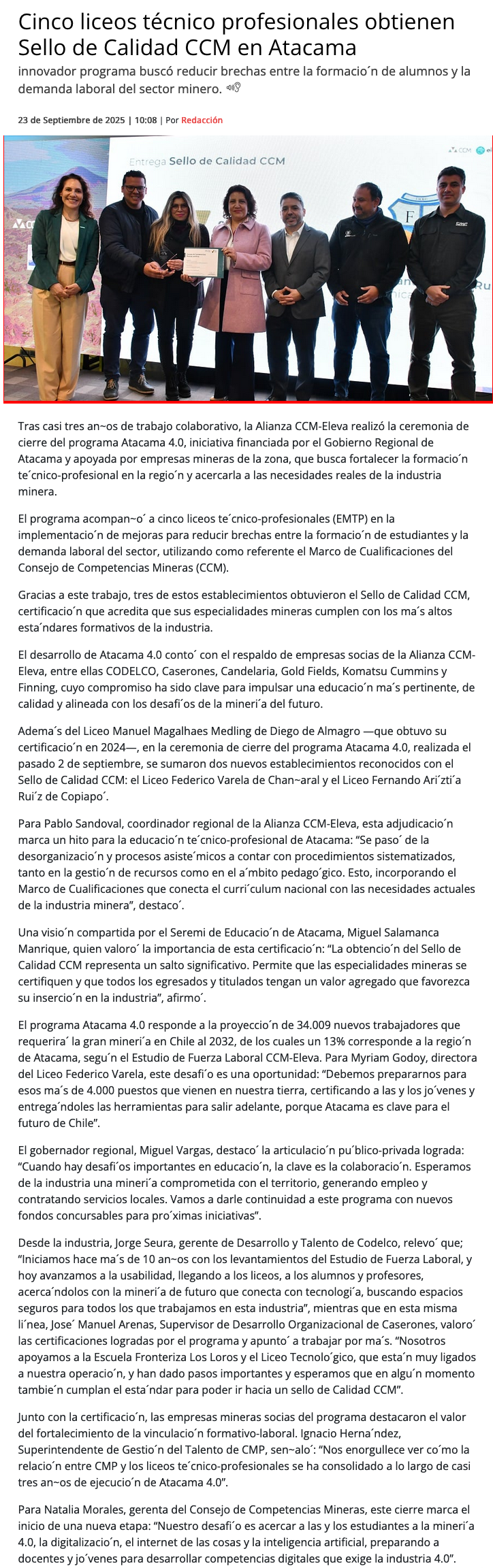 Liceos Técnico Profesional de la región obtienen Sello de Calidad CCM en el cierre del programa FIC Atacama 4.0 - (fch.cl)