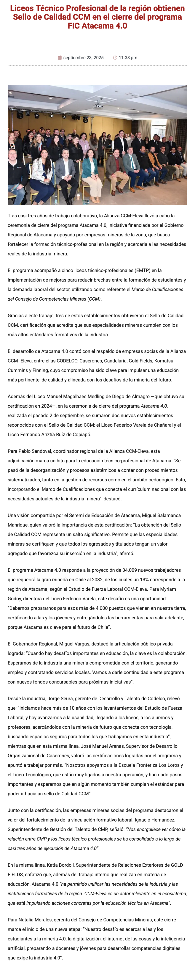 Liceos Técnico-Profesionales de Atacama reciben Sello de Calidad CCM en cierre del programa Atacama 4.0 - (mineriayfuturo.cl)