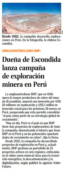 BHP anuncia US$ 10 millones en exploración en Perú para los próximos 18 meses - (dfsud.com)