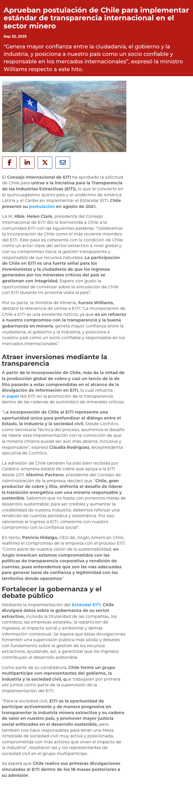 Chile se une a iniciativa para la Transparencia de las Industrias Extractivas, con foco en minerales críticos - (electromineria.cl)
