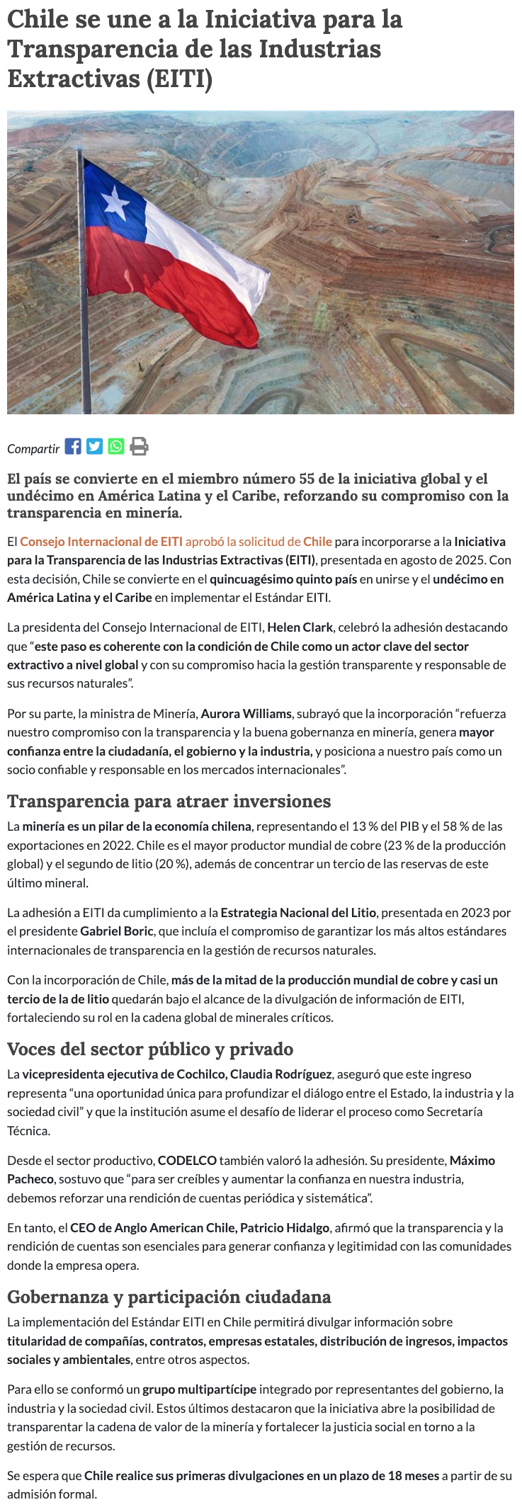 Chile se une a iniciativa para la Transparencia de las Industrias Extractivas, con foco en minerales críticos - (electromineria.cl)