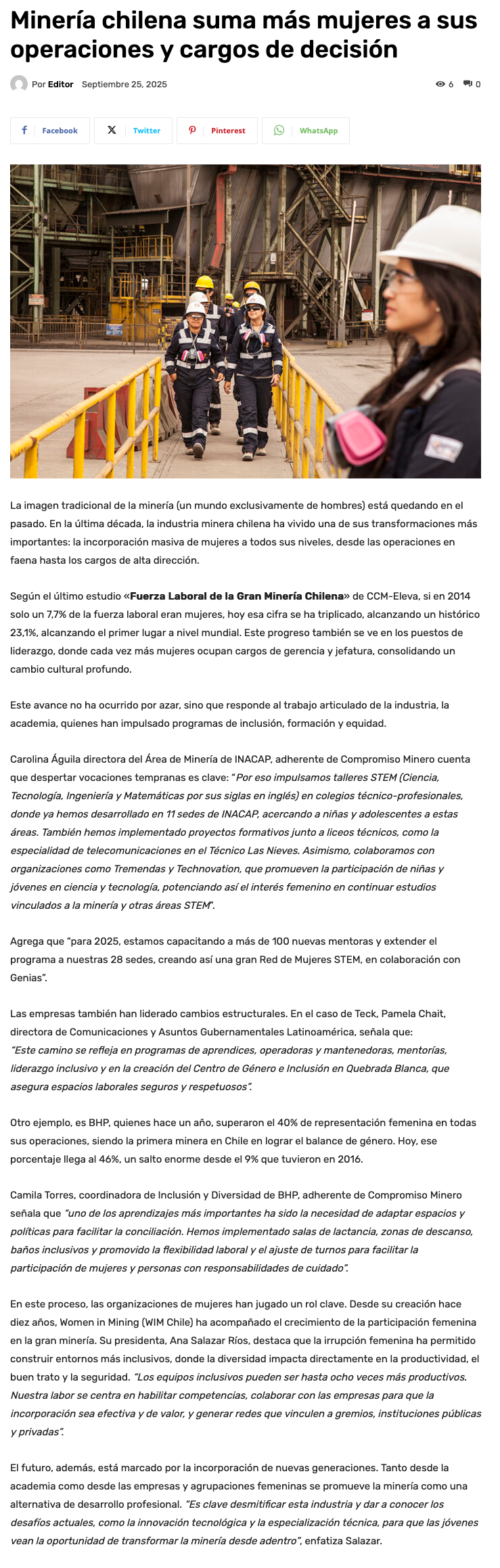Minería chilena suma más mujeres a sus operaciones y cargos de decisión - (guiaminera.cl)