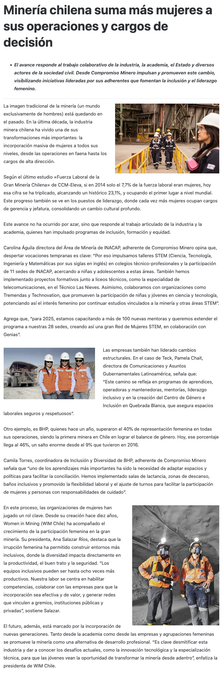 Minería chilena suma más mujeres a sus operaciones y cargos de decisión - (lavozdelamineria.cl)