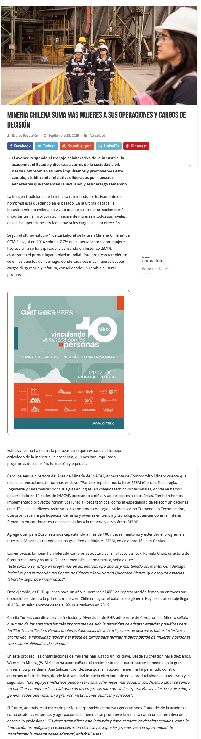 Minería chilena suma más mujeres a sus operaciones y cargos de decisión - (norteonline.cl)