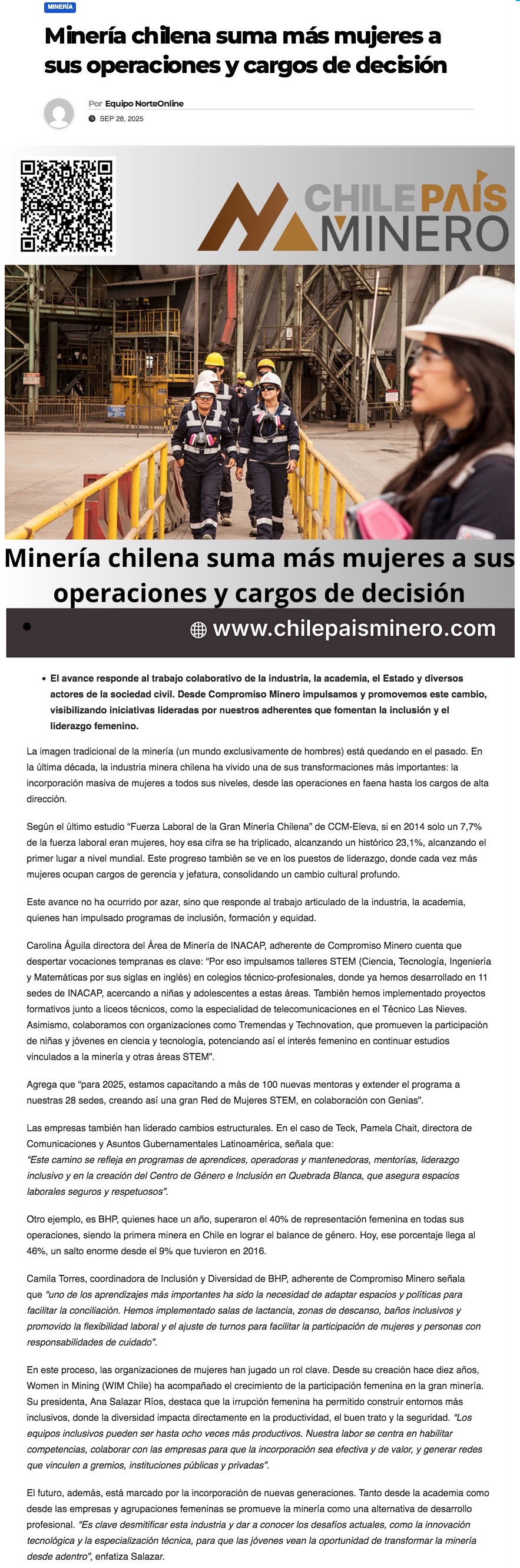 Minería chilena suma más mujeres a sus operaciones y cargos de decisión - (chilepaisminero.com)