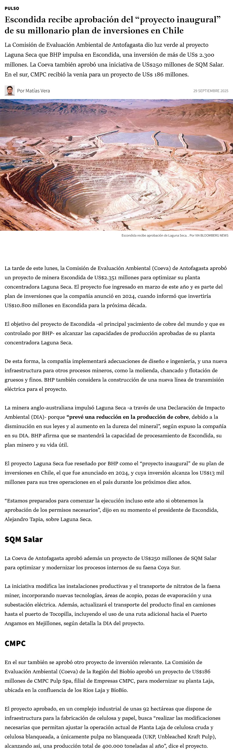 Coeva aprueba dos proyectos mineros de SQM Industrial y Escondida por US$2.600 millones - (El Mercurio de Antofagasta)