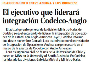 Codelco nombra a Gonzalo Lara como vicepresidente de Integración de Operaciones Andina - (La Tercera Online)