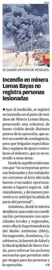 Minera Lomas Bayas, de Glencore, registra incendio en patio de residuos, pero empresa informa que no se produjeron lesionados - (DF Online)