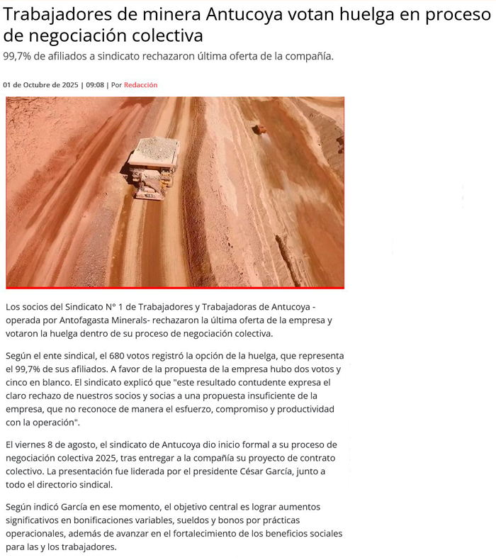 Sindicato de Antucoya rechaza la última oferta de la empresa y aprueba la huelga - (El Mercurio de Antofagasta)