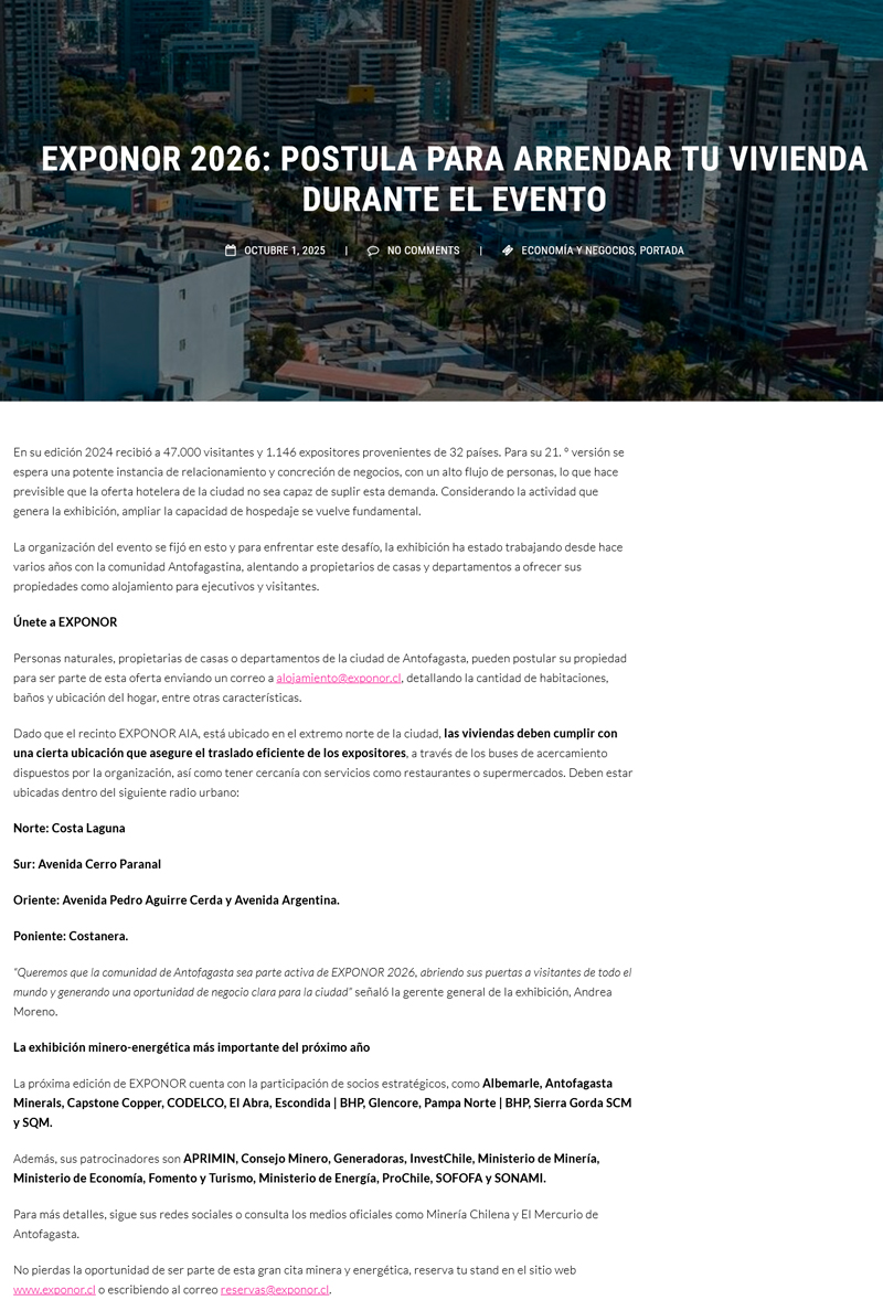 Antofagasta se prepara para EXPONOR 2026: Postula tu propiedad como alojamiento y sé parte de la mayor exhibición minera del año - (norteyenegia.cl)