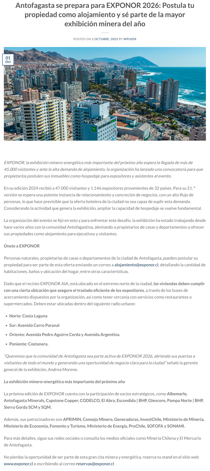 Antofagasta se prepara para EXPONOR 2026: Postula tu propiedad como alojamiento y sé parte de la mayor exhibición minera del año - (madero.cl)