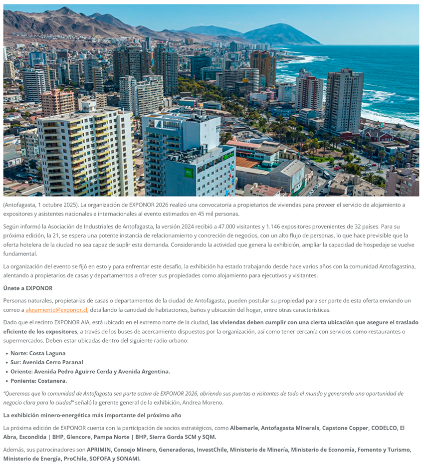 Antofagasta se prepara para EXPONOR 2026: Postula tu propiedad como alojamiento y sé parte de la mayor exhibición minera del año - (norteyenegia.cl)