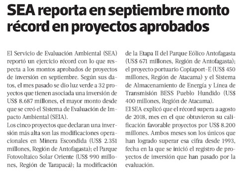 SEA reporta en septiembre monto récord en los proyectos de inversión aprobados - (La Tercera Online)