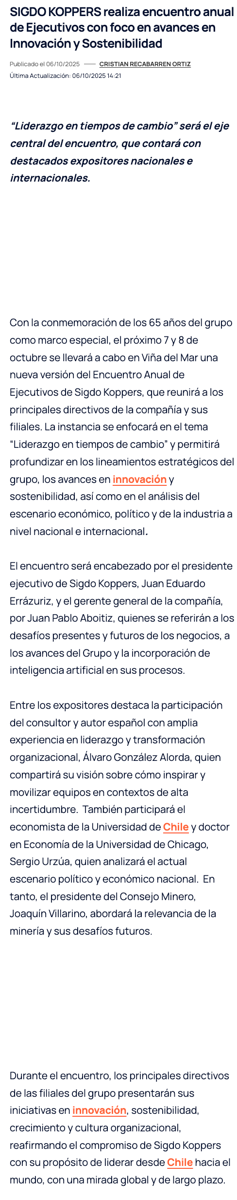 Sigdo Koppers celebra 65 años con encuentro anual centrado en liderazgo, innovación y sostenibilidad - (reporteminero)