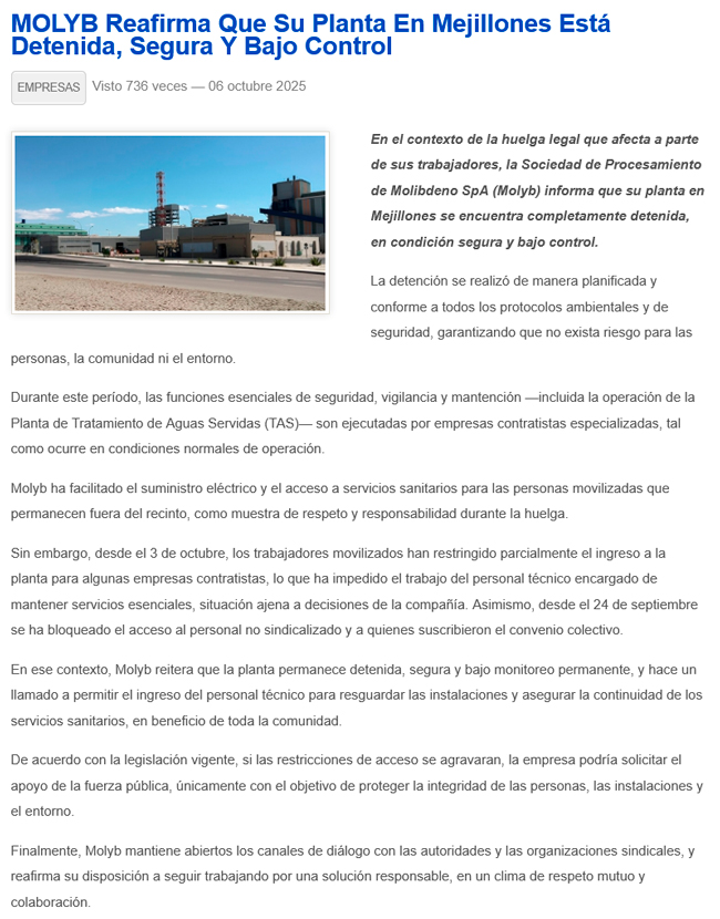 Molyb negociará hoy con los sindicatos que están en huelga - (La Estrella)