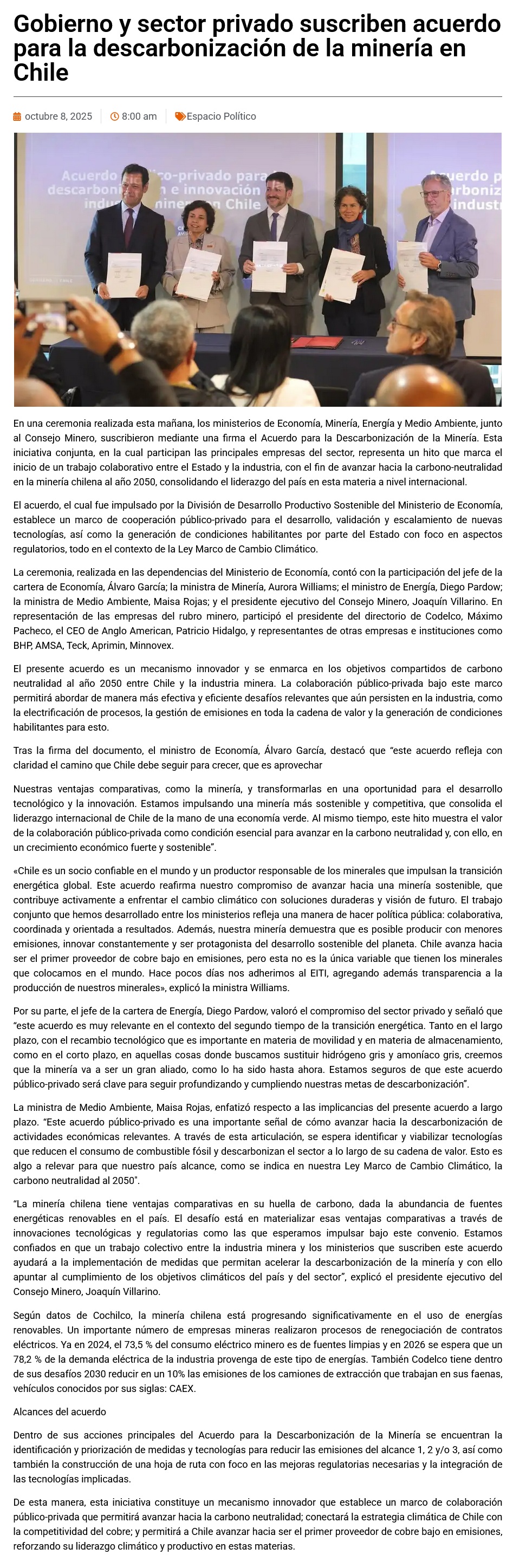Gobierno y sector privado suscriben acuerdo para la descarbonización de la minería en Chile - (portalVallenarDigital.cl)