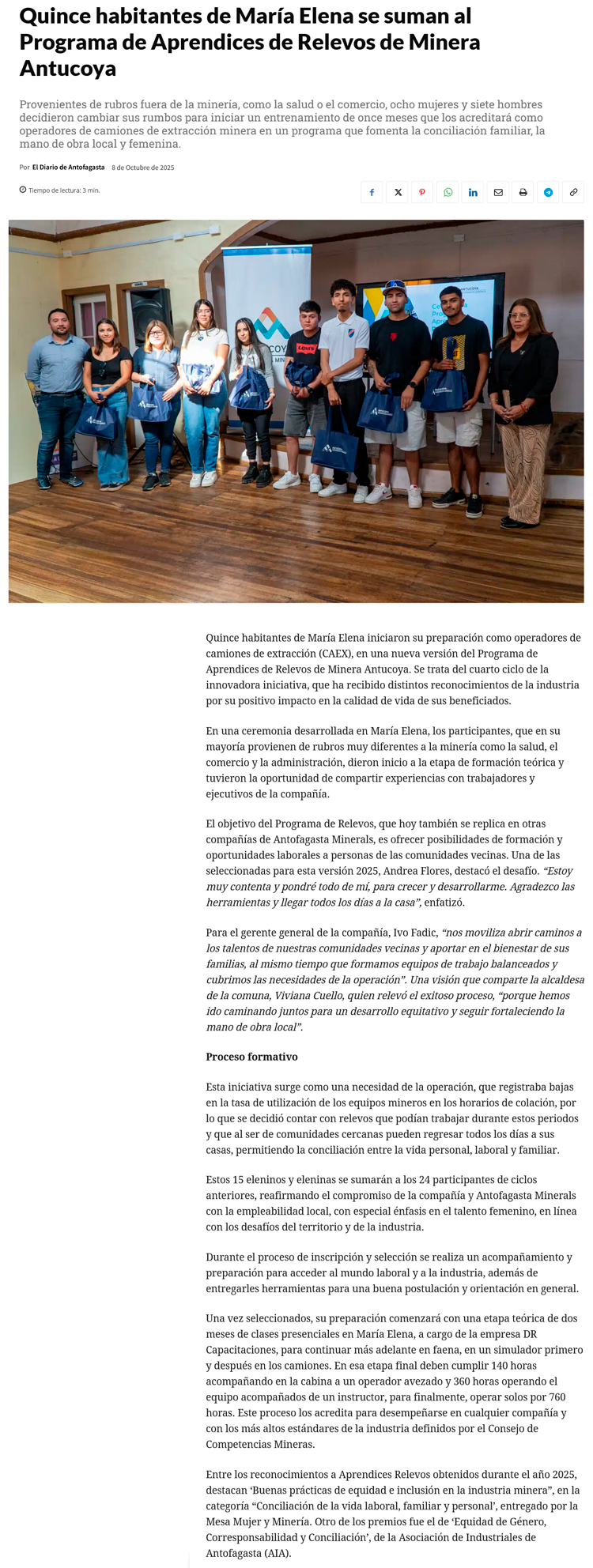 Minera Antucoya capacita a 15 aprendices de María Elena en programa de relevos - (nuevaminería online)