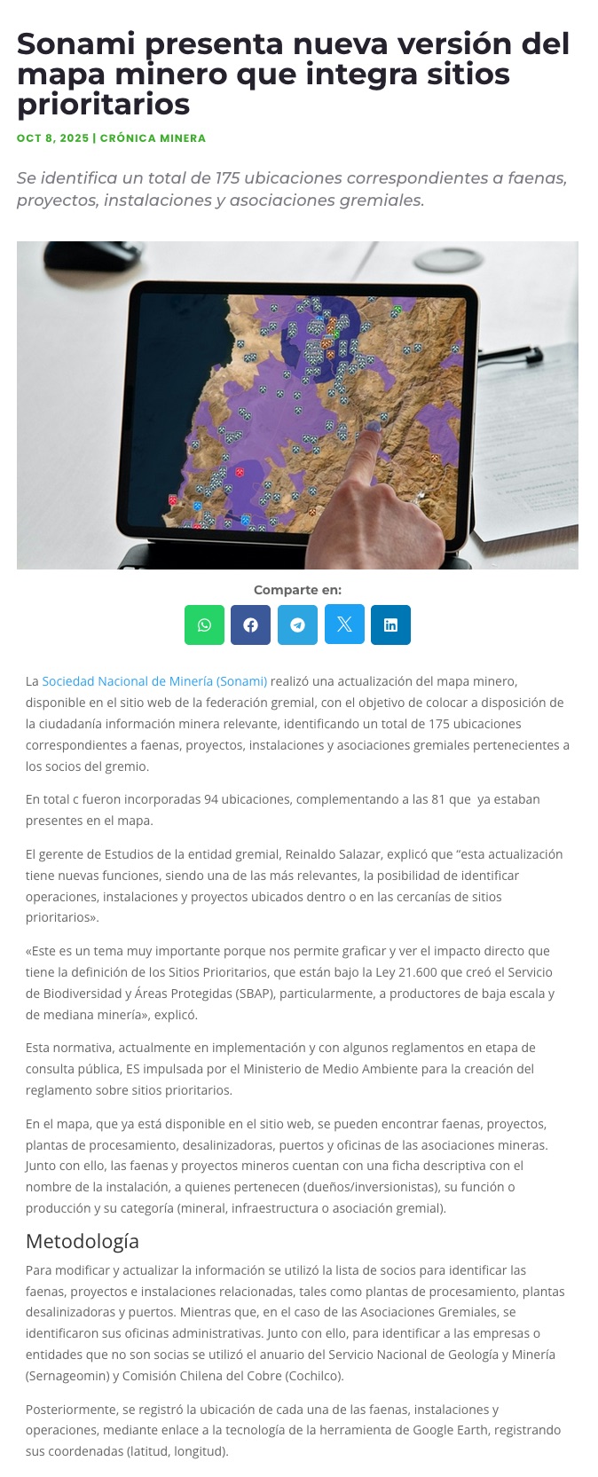 Sonami alerta por listado de sitios prioritarios: 273 instalaciones mineras están dentro de esas áreas - (Pulso)