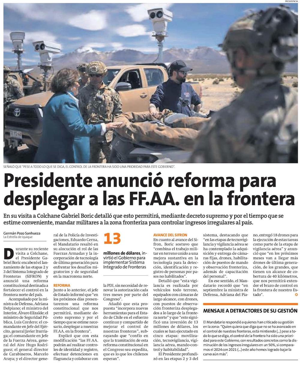 Boric anuncia reforma constitucional para extender la presencia militar en la frontera - (Diario Financiero)