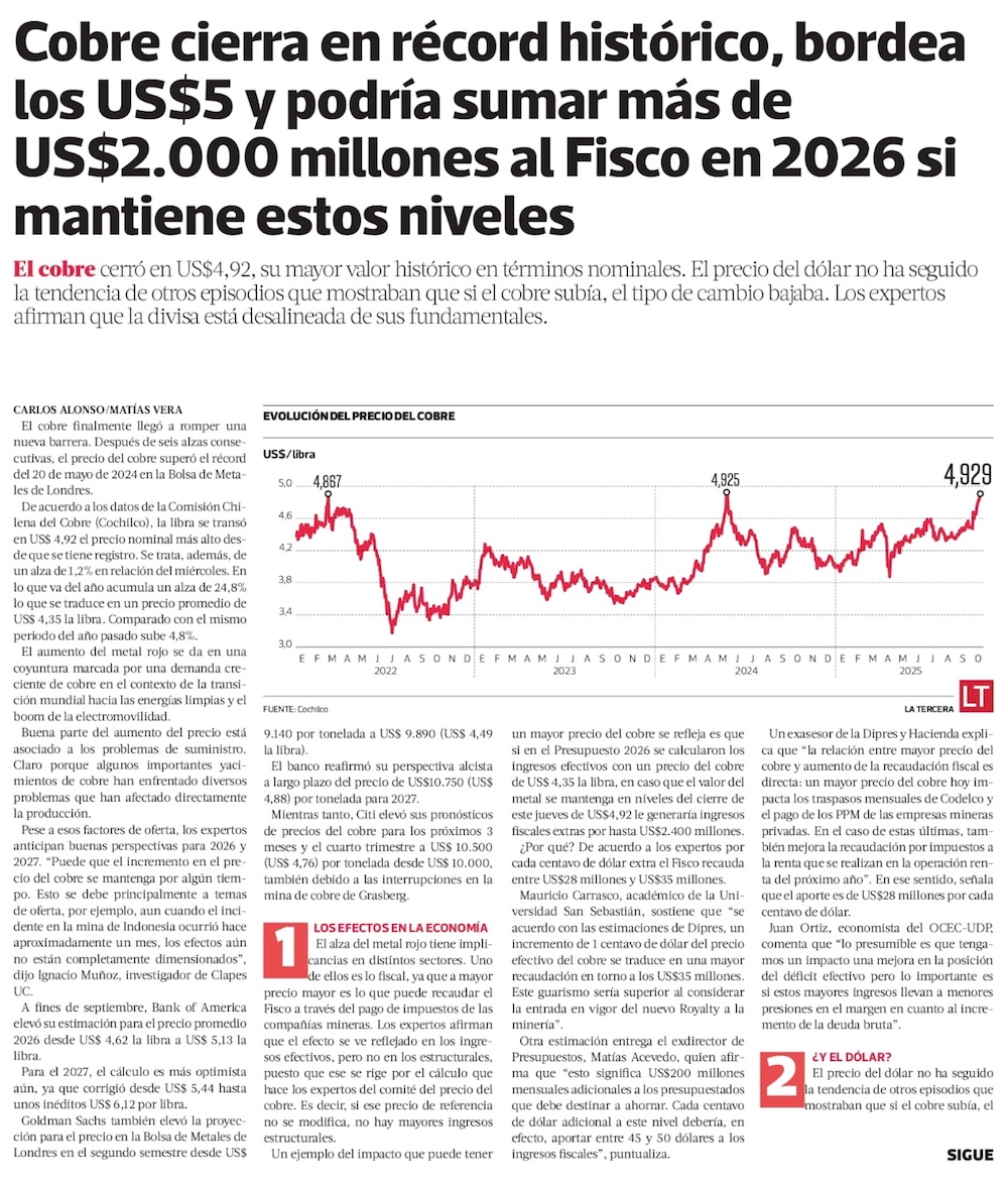 Los “planetas se alinean”... el cobre alcanza precio récord y queda a un paso de los US$ 5 - (El Mercurio de Santiago)