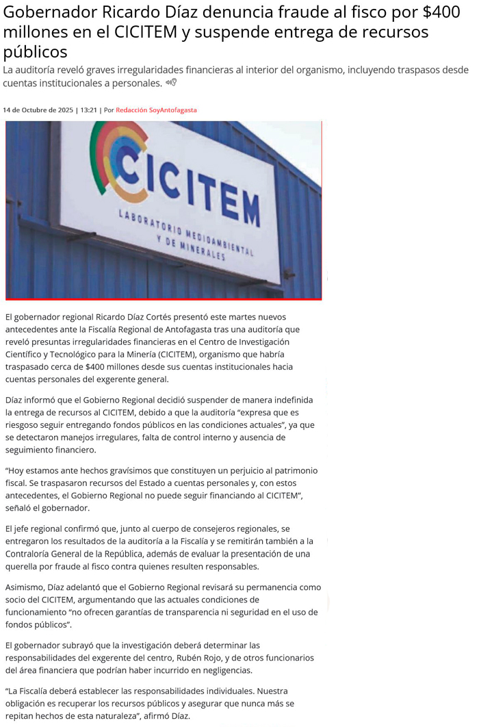 "Las condiciones actuales del Cicitem no dan seguridad respecto al traspaso de recursos públicos" - (El Mercurio de Antofagasta)