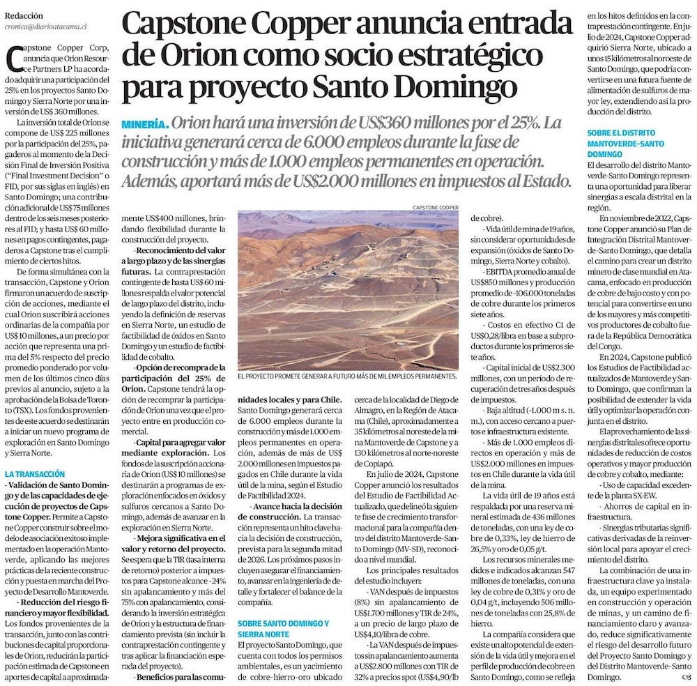 Capstone Copper anuncia entrada de Orion como socio para proyecto Santo Domingo, con inversión de US$360 millones - (Pulso)